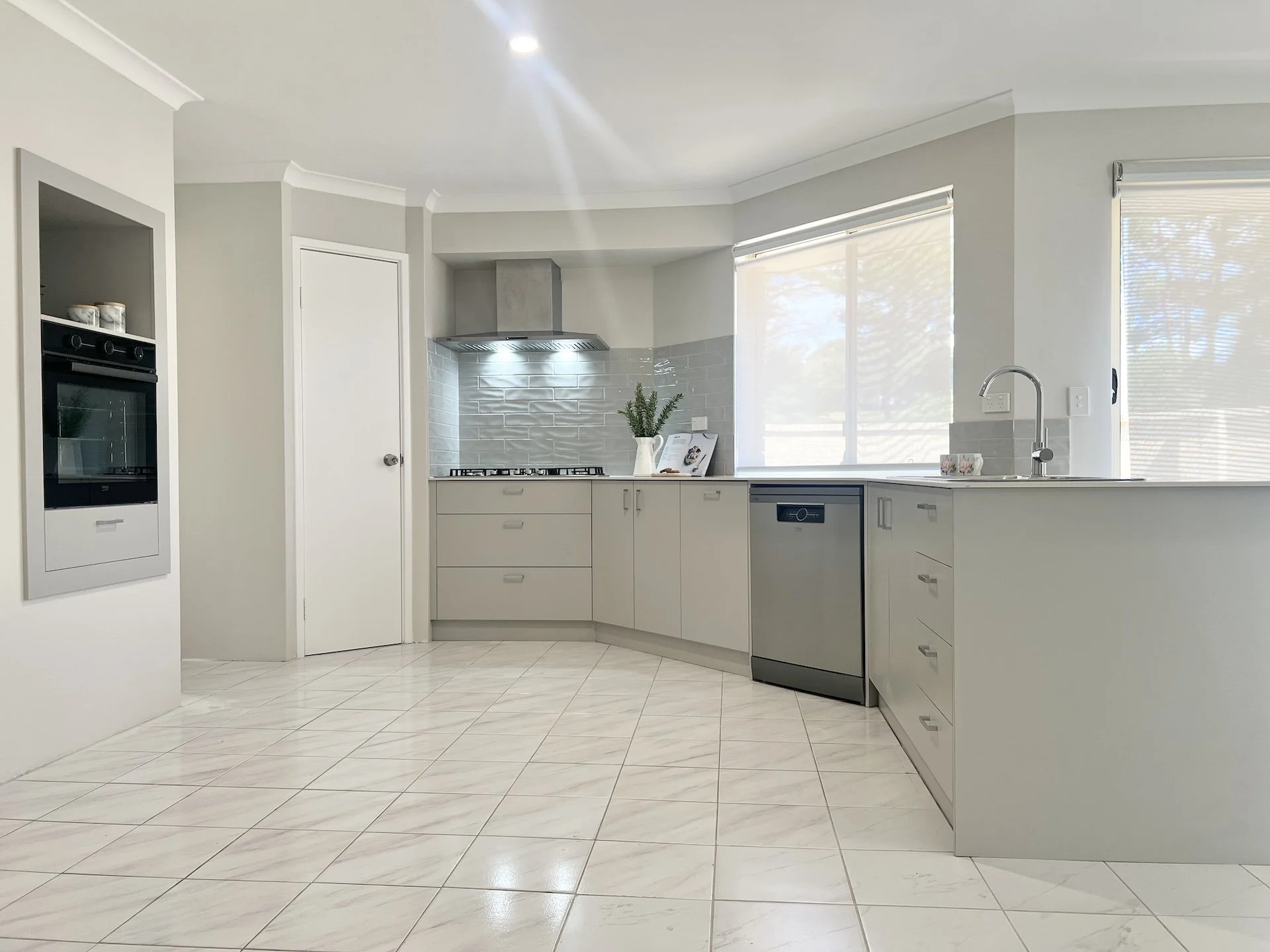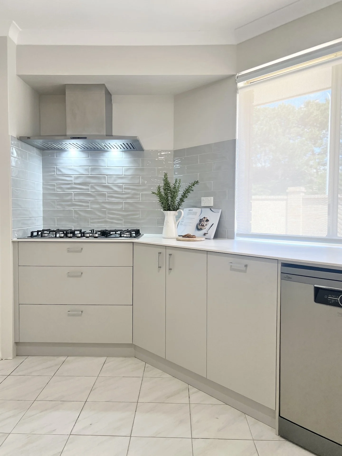 ⬦ Modern appliances and lighting throughoutThe soft grey palette creates a calm, contemporary atmosphere while the textured wall tiles add depth and visual interest. Every element was carefully selected to create a cohesive design that will stand the test of time.
